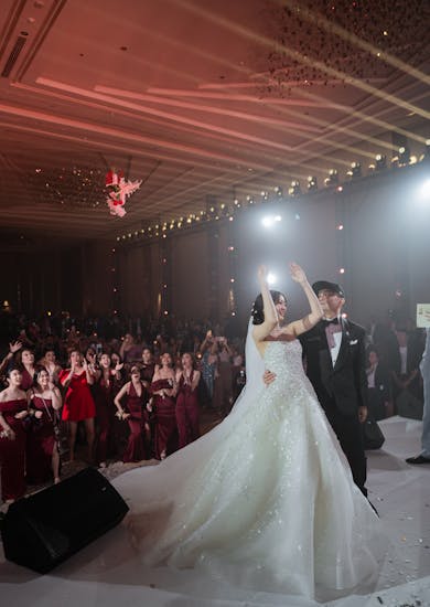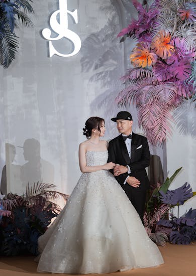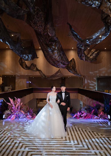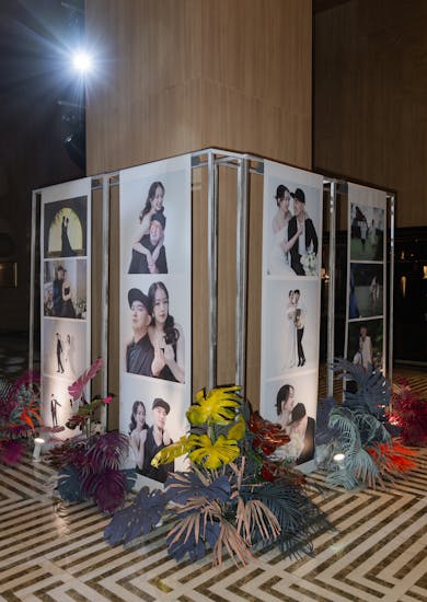 ช่วงงานเลี้ยงฉลองตอนเย็นจัดที่ห้อง Richmond Grand Ballroom เพราะเดิมเราวางสเกลงานไว้ใหญ่มาก ขนาดของห้องจึงสำคัญ ต้องเลือกห้องที่รองรับได้มากกว่า 1,000 คนอย่างห้องนี้ค่ะ ประกอบกับเราชอบดีไซน์ภายในห้องมาก มีพรมที่ทั้งนุ่มและสวย นอกจากนั้นยังมีจอ LED ขนาดใหญ่ถึง 4 จอ ซึ่งพี่ชัชชอบมาก เราคิดว่าน่าจะเล่นอะไรกับจอได้เยอะ ส่วนตัวจินเองโดนบันไดตรงโถงกลางตกตั้งแต่เดินขึ้นมาเลยค่ะ รู้สึกว่าตัวบันไดดูสวย อลังการ เหมือนเราเห็นภาพงานแต่งในหัวมากขึ้น จึงตัดสินใจเลือกห้องนี้ค่ะ