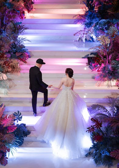 ประกอบกับเจ้าบ่าวไม่อยากได้สไตล์การตกแต่งด้วยดอกไม้ “ไม่ชอบเห็นดอกไม้ในงานเยอะๆ ชอบเห็นคนในงานเยอะๆ ครับ” เจ้าบ่าวบอกมาแบบนั้น ทีม Fordeara เลยใช้ใบไม้จำพวกปาล์มทาสีจัดๆ เหมือนสาดสีใส่ จากนั้นก็ใช้พวก Lighting มาช่วยเสริมตรงบันไดโถง ไล่สีให้สวยงงามตามธีม Colorful ค่ะ