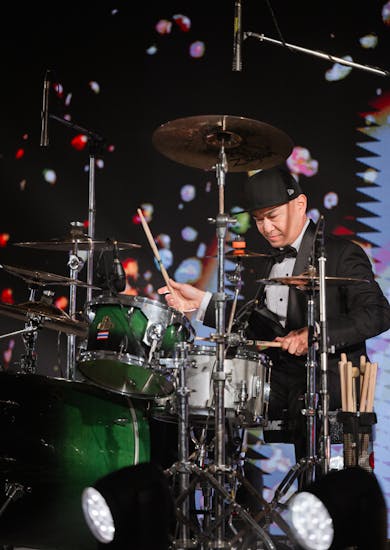 ช่วงเวลานี้เราได้ใช้ภาพ Motion และแสง ทำให้แขกโฟกัสไปที่บ่าวสาว โดย Motion ที่เลือกจะเป็นภาพดำทั้งจอและมีหยดน้ำหลากสีที่ขยับไหวไปมาคล้ายเปลวไฟตรงข้างหลังพี่ชัชที่ทำหน้าที่ตีกลองเพื่อให้เด่นขึ้นมา ซึ่งพอจบการแสดงตรงนั้น พี่ชัชก็จะมารับจินแล้วพาขึ้นเวทีไปพร้อมกันค่ะ