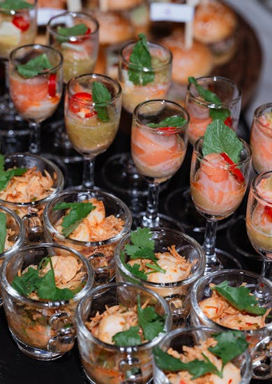 ส่วนของอาหารในงาน จินเลือกเป็นค็อกเทลที่สามารถหยิบทานได้สะดวกและมีการตกแต่งที่น่ารักค่ะ จินชอบอาหารของโรงแรมแกรนด์ริชมอนด์มาก ก่อนวันจัดงานจะมีให้ลองชิมอาหาร พอได้ชิมแล้ว จินโฆษณากับเพื่อนทุกคนเลยว่าอร่อยจริงๆ ซึ่งแขกที่มาร่วมงานก็บอกเป็นเสียงเดียวกันว่าอาหารในไลน์คืออร่อยทุกอย่าง ขนมก็อร่อย แอบเสียดายที่วันงานบ่าวสาวมีเวลาน้อยก็เลยไม่ค่อยได้ทานค่ะ(หัวเราะ)