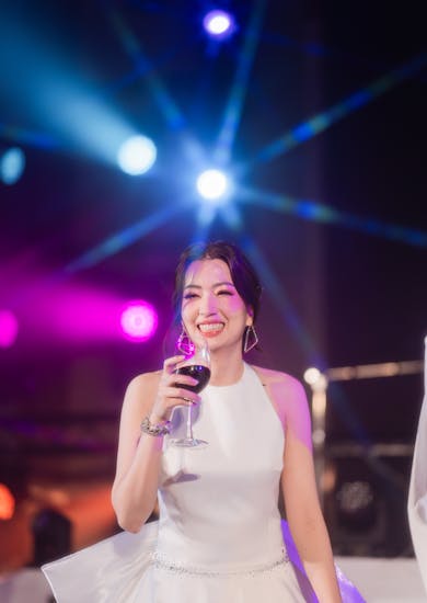 สำหรับ After Party หลังเราไปเปลี่ยนชุดแล้วก็จะมีเปิดตัวอีกครั้ง ซึ่งมีคนเคยแนะนำว่าถ้าอยากดูพิเศษ มีสีสันมากขึ้น ให้ใส่กิมมิกนิดนึงตอนเปิดตัว เราเลยเดินเข้างานพร้อมแก้วเบียร์ขนาดใหญ่พิเศษที่ทำเป็นทรงแก้วแชมเปญ หลายคนสนใจอยู่นะคะ เพราะแก้วใหญ่มากจริงๆ ก็ขำๆ กันไป(หัวเราะ) แล้วด้วยในแพ็กเกจเราได้รับแชมเปญ 1 ขวดเป็น Complimentary เราจึงให้ทางโรงแรมทำ Champagne Tower ไว้ด้วย และตอนที่เริ่มรินแชมเปญมีการยิง Paper Shoot เป็นซีนที่ออกมาดูดีเลยค่ะ