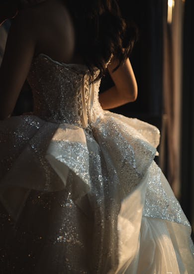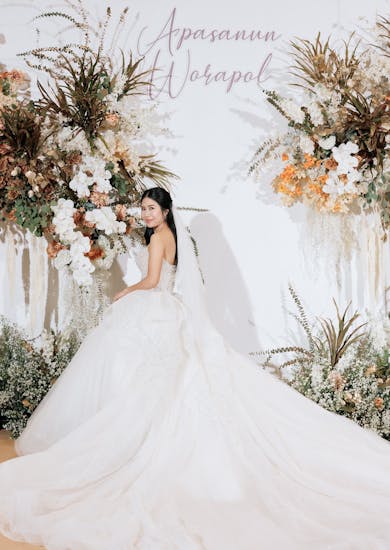 สำหรับตัวอีฟ ตอนแรกที่เลือกชุดก็อยากได้แบบมินิมอล เลยว่าจะเลือกแบบเรียบๆ ค่ะ แต่พอเห็นความหรูหราของตัวโรงแรมแล้วเลยรู้สึกว่าเล่นใหญ่ได้ บวกกับแม่เจ้าสาวใส่เต็มมา เลยรู้สึกว่าจะแพ้ไม่ได้จึงใส่จัดเต็มเหมือนกันค่ะ ก็จัดงานแต่งในโรงแรมไง เลือกแต่งแบบชุดใหญ่ได้(หัวเราะ) แต่ไม่ว่าจะเลือกแบบไหนสิ่งสำคัญที่สุดก็คือเลือกชุดที่เราชอบค่ะ