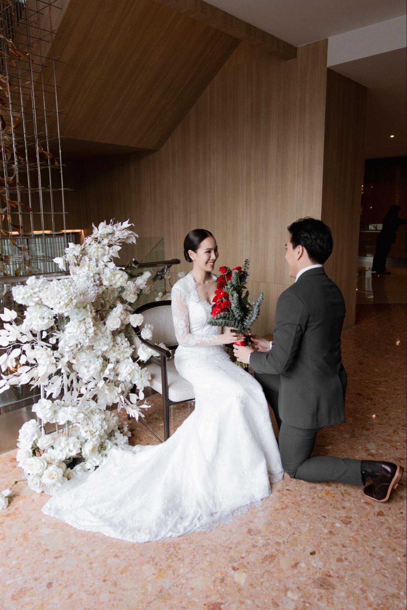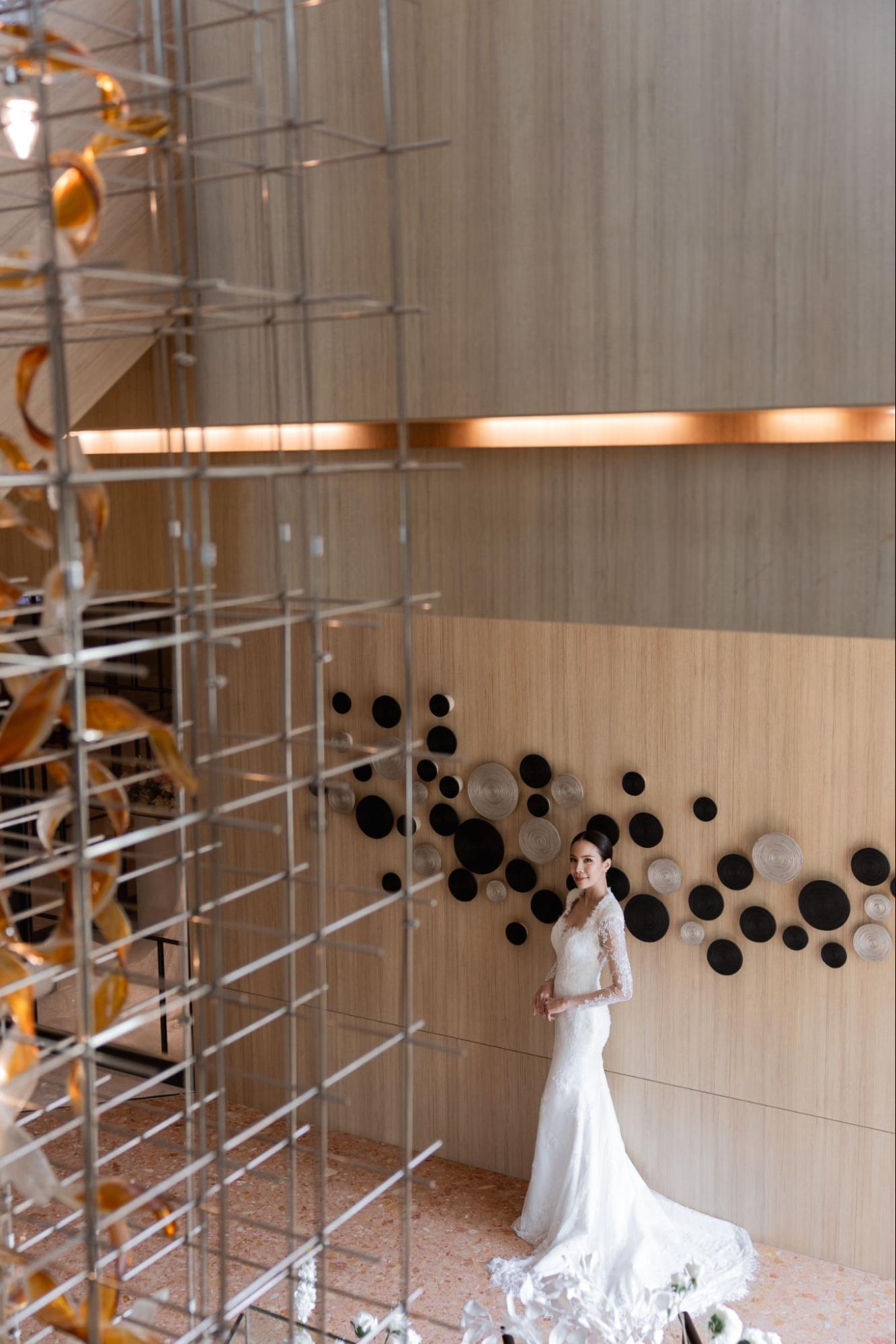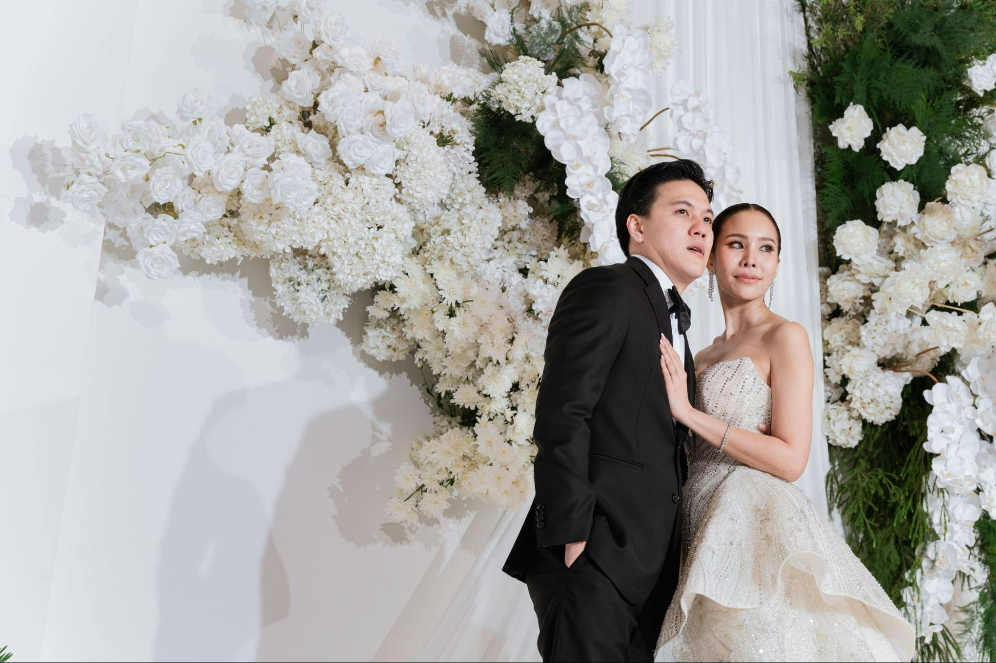 พวกไอเดียตกแต่งเราอยากได้แบบพอดีๆ เน้นเรียบหรูดูแพง ตรงแกลลอรี่เราเลยไม่เอาซุ้ม ใช้แค่ขาตั้งรูป อยากให้โล่งและคลีนที่สุด ดอกไม้ก็ใช้เป็นสีขาว ไม่ถมมากเพราะไม่อยากให้รกตา ตัวฉากตอนแรกเราออกแบบมาเป็นฉากเรียบๆ แต่เรารู้สึกว่ามันดูแบนไปหน่อย ทางทีม Fordeara จึงแนะนำให้เพิ่มงานผ้าเข้ามาและตกแต่งดอกไม้อีกนิดๆ หน่อยๆ ซึ่งช่วยได้เยอะเลยค่ะ เอาจริงๆ เราไม่ได้คาดหวังว่ามันจะต้องออกมาเปะปัง และในวันงานเราก็ไม่ได้มีเวลามาดื่มด่ำกับการตกแต่งฉากนัก กว่าจะได้ดูจริงๆ ก็เป็นตอนที่มานั่งดูรูปถ่ายย้อนหลัง ซึ่งพอมาย้อนดูแล้วเราถึงรู้สึกว่า “เออ มันสวยเนาะ” เฉยเลย (หัวเราะ) พอดูแล้วเราคิดว่างานผ้าช่วยได้มากจริงๆ สำหรับคนที่อยากได้สไตล์เรียบหรูค่ะ