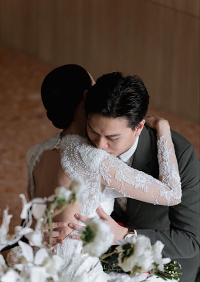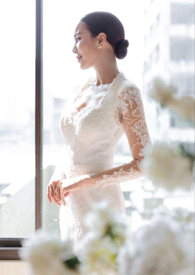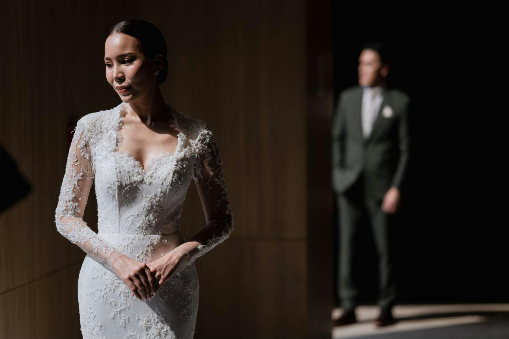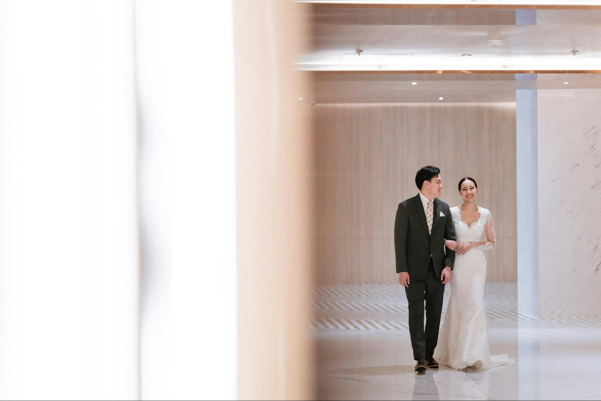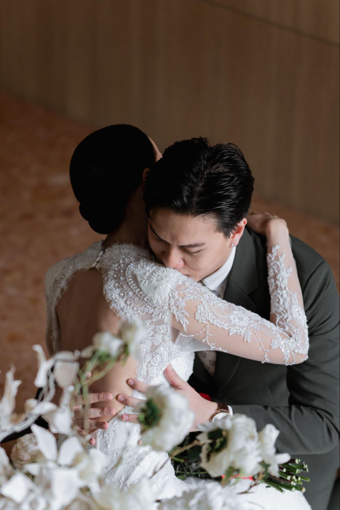 พวกไอเดียตกแต่งเราอยากได้แบบพอดีๆ เน้นเรียบหรูดูแพง ตรงแกลลอรี่เราเลยไม่เอาซุ้ม ใช้แค่ขาตั้งรูป อยากให้โล่งและคลีนที่สุด ดอกไม้ก็ใช้เป็นสีขาว ไม่ถมมากเพราะไม่อยากให้รกตา ตัวฉากตอนแรกเราออกแบบมาเป็นฉากเรียบๆ แต่เรารู้สึกว่ามันดูแบนไปหน่อย ทางทีม Fordeara จึงแนะนำให้เพิ่มงานผ้าเข้ามาและตกแต่งดอกไม้อีกนิดๆ หน่อยๆ ซึ่งช่วยได้เยอะเลยค่ะ เอาจริงๆ เราไม่ได้คาดหวังว่ามันจะต้องออกมาเปะปัง และในวันงานเราก็ไม่ได้มีเวลามาดื่มด่ำกับการตกแต่งฉากนัก กว่าจะได้ดูจริงๆ ก็เป็นตอนที่มานั่งดูรูปถ่ายย้อนหลัง ซึ่งพอมาย้อนดูแล้วเราถึงรู้สึกว่า “เออ มันสวยเนาะ” เฉยเลย (หัวเราะ) พอดูแล้วเราคิดว่างานผ้าช่วยได้มากจริงๆ สำหรับคนที่อยากได้สไตล์เรียบหรูค่ะ