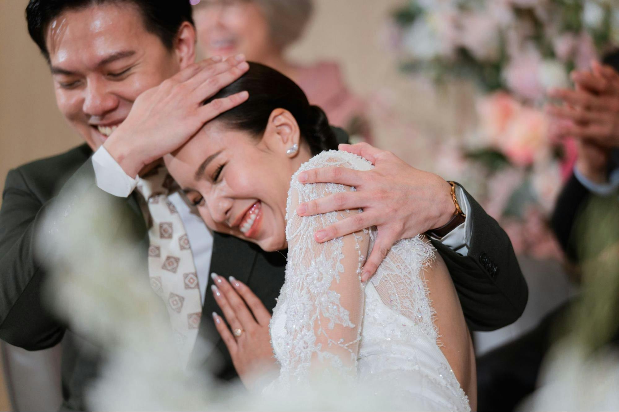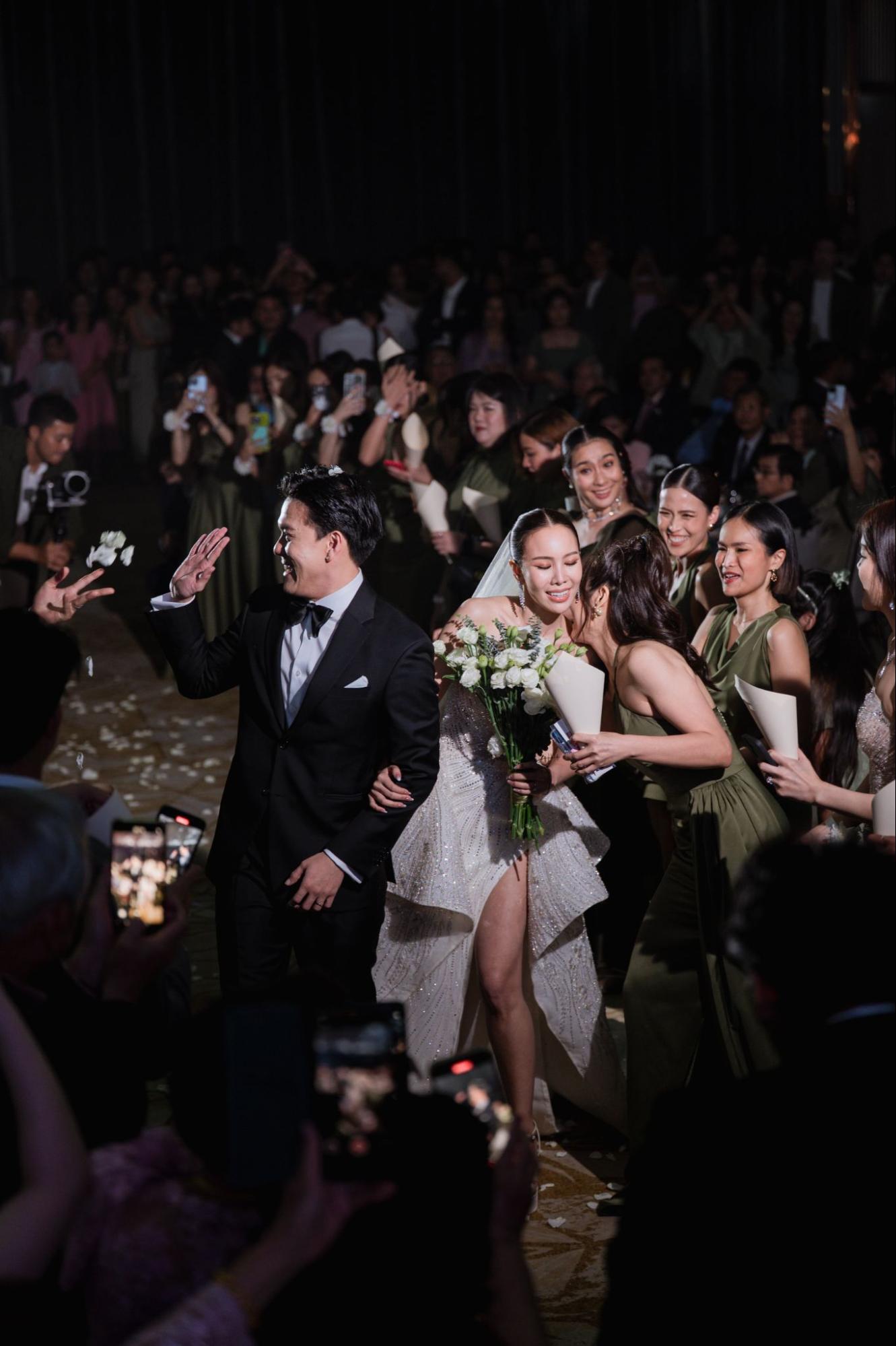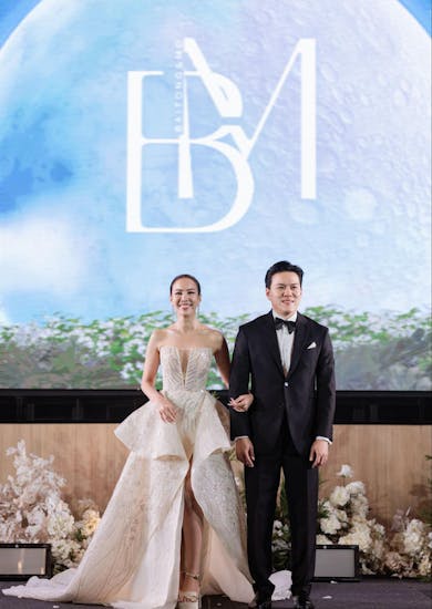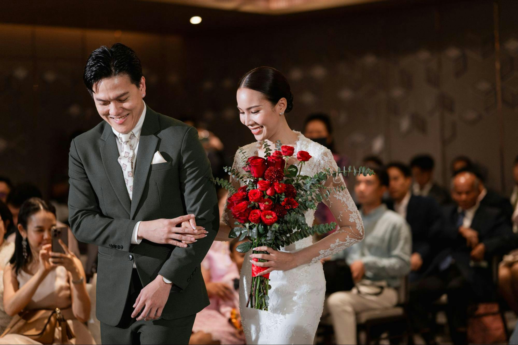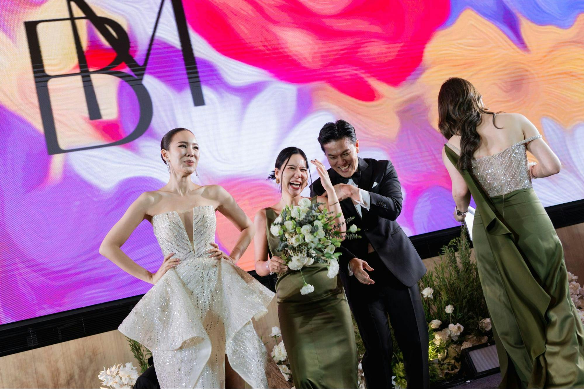 ให้มาเล่าย้อนไปในวันที่จัดงาน ใบตองรู้สึกประทับใจหลายอย่างมากค่ะไม่ว่าจะทั้งเรื่องของบรรยากาศ หรือทีมงานหลังบ้านที่คอยช่วยซัพพอร์ตอยู่เสมอ ถ้าถามว่ามีเรื่องที่ผิดพลาดบ้างไหม เราคิดว่ามันคงมีแหละค่ะ แต่คงเป็นเรื่องที่เล็กมากๆ จนเราไม่ทันสังเกตและทางทีมงานที่ช่วยดูแลคงจัดการได้จนเรื่องไม่ต้องมาถึงเรา ส่วนตัวเราโฟกัสกับบรรยากาศในงานมากกว่า เช่น โมเม้นท์ในงานตอนที่เพื่อนขึ้นพูดอวยพร เราซึ้งใจมาก ทั้งร้องไห้และมีความสุขเพราะพวกเราผ่านอะไรมาด้วยกันเยอะมากจริงๆ ตอนที่พี่ป้อง (คุณณวัฒน์ กุลรัตนรักษ์) พ่อสื่อของเราอวยพรให้ก็เช่นกัน เขาก็มาเล่าย้อนว่าเรากับแฟนมาเจอกันได้ยังไง ก็เป็นโมเม้นท์น่ารักๆ ค่ะ ที่ขำที่สุดเลยก็คงเป็นตอนที่โยนดอกไม้ แล้วเพื่อนที่รับได้คือคนที่ได้ช่อดอกไม้ในงานแต่งอื่นๆ รวมแล้วเป็นช่อที่ 10 ได้ (หัวเราะ)