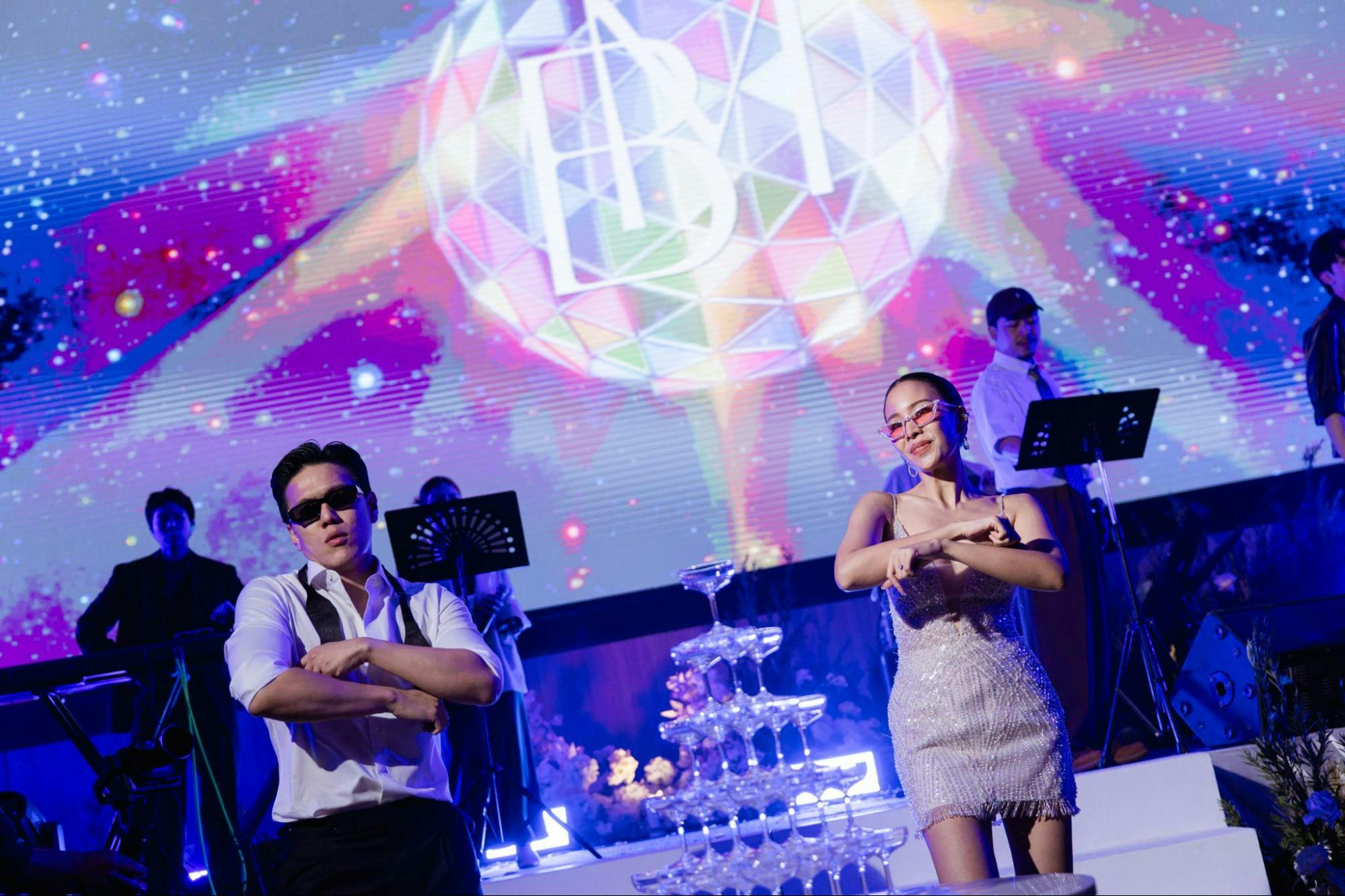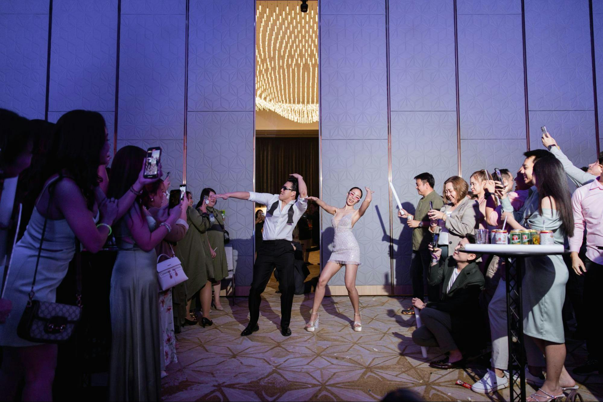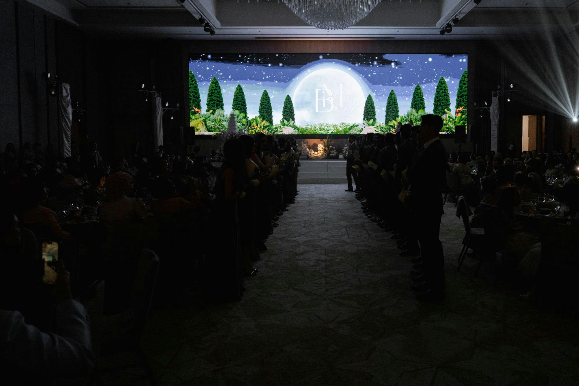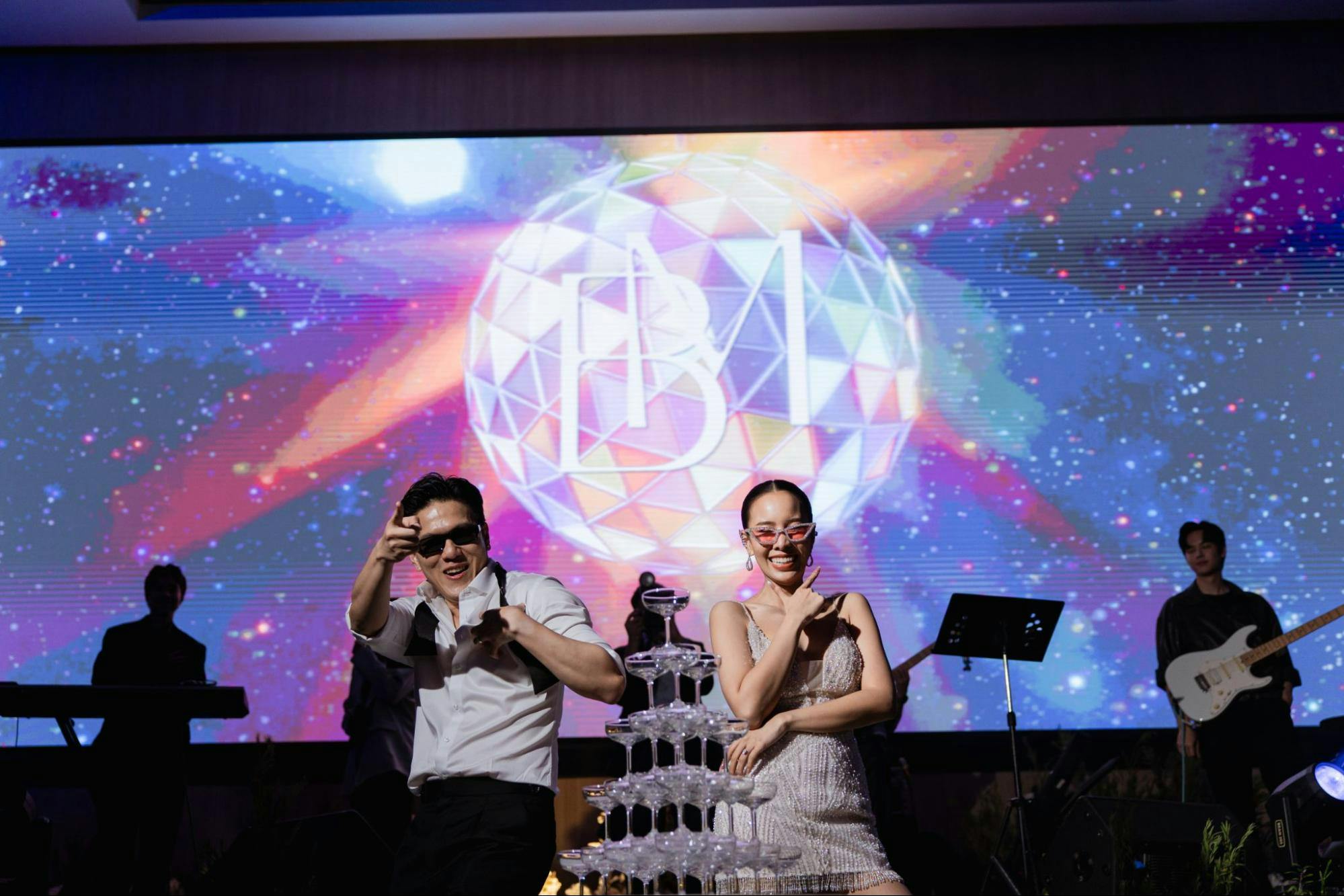 พวกโมชั่นในงาน อาจเป็นเพราะเราเป็นพิธีกรมืออาชีพ เราเลยดูพวกซีเควนงานเป็นอยู่แล้วว่าจะเริ่มด้วยอะไร อารมณ์ในแต่ละซีนต้องการแบบใดต้องเลือกโทนไหนถึงจะเข้ากัน เช่น การเปิดตัวคนส่วนใหญ่จะโฟกัสกับทางบ่าวสาวมากกว่า เราจึงใช้รูปที่เน้นเสริมบรรยากาศตามธีมเรา พิธีการก็ทำให้เรียบง่ายไม่หวือหวา ตัดเค้กก็เอาแบบอลังการจุดพลุเฉลิมฉลองไปเลย ส่วนตอนโยนดอกไม้ก็เลือกที่ดูมีสีสันมากๆ หน่อยให้เข้ากับความสนุกสนาน ลองดูว่าเราต้องการสร้างบรรยากาศแบบไหนค่ะ